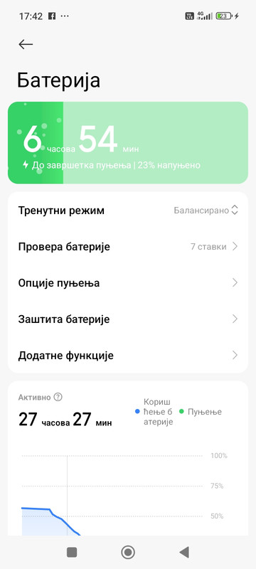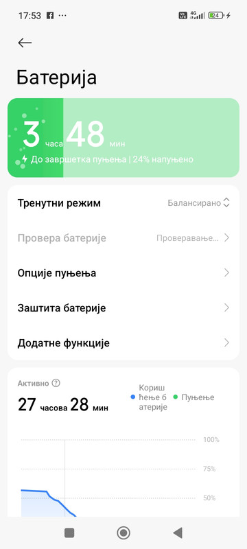 Телефон скоро две године, има рецензија, била та опција па да успори. Нервирала ме и некако сам то искључио или је сама нестала. Колеги сам преко Тему поручио кабал за пуњење мобилних телефона, плетени 0,2к и он каже да му се њему и жени брже пуне телефони. На први поглед тај кабл изузетно добро на око изгледа. Испред конектора има плочицу. Кажем на изглед одличан а изгледа и ради како треба. Мој телефон користи оригинал пуњач и кабл који су били у пакету. Батерију од нуле до 100% пуни за нешто више од 45 минута, 67W. |